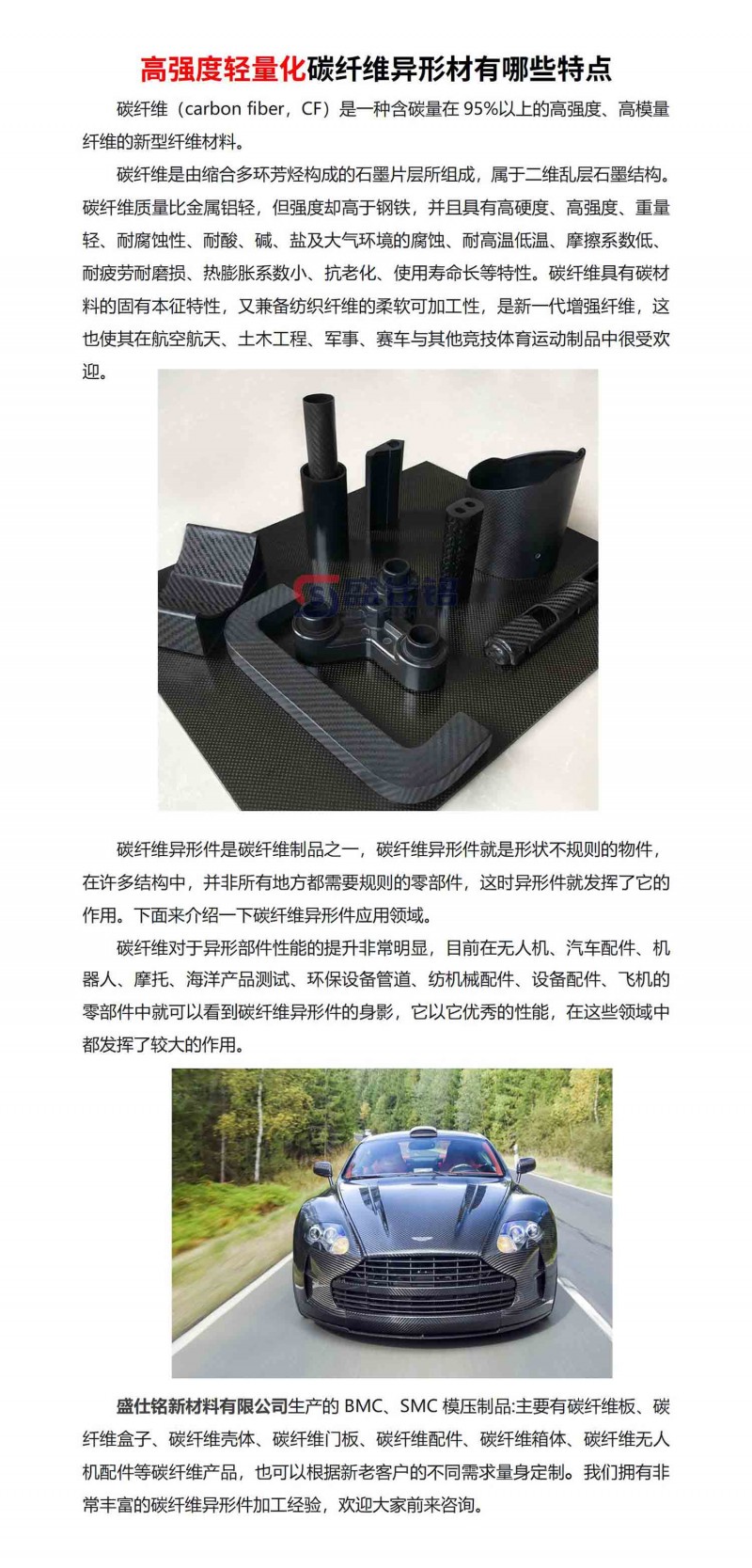 盛仕铭新材料有限公司生产的BMC、SMC模压制品:主要有碳纤维板、碳纤维盒子、碳纤维壳体、碳纤维门板、碳纤维配件、碳纤维箱体、碳纤维无人机配件等碳纤维产品,也可以根据新老客户的不同需求量身定制。我们拥有非常丰富的碳纤维异形件加工经验,欢迎大家前来咨询。