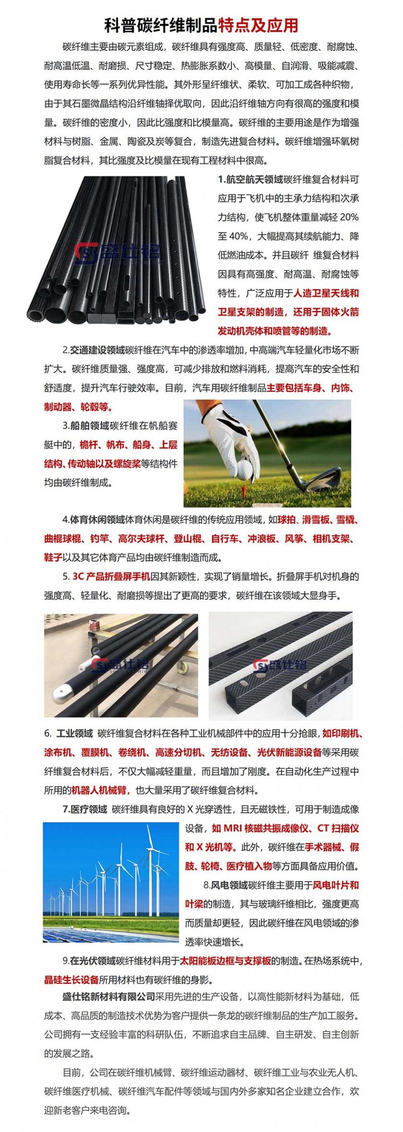 碳纤维主要由碳元素组成,碳纤维具有强度高、质量轻、低密度、耐腐蚀、耐高温低温、耐磨损、尺寸稳定、热膨胀系数小、高模量、自润滑、吸能减震、使用寿命长等一系列优异性能。其外形呈纤维状、柔软、可加工成各种织物,由于其石墨微晶结构沿纤维轴择优取向,因此沿纤维轴方向有很高的强度和模量。碳纤维的密度小,因此比强度和比模量高。碳纤维的主要用途是作为增强材料与树脂、金属、陶瓷及炭等复合,制造先进复合材料。碳纤维增强环氧树脂复合材料,其比强度及比模量在现有工程材料中很高。