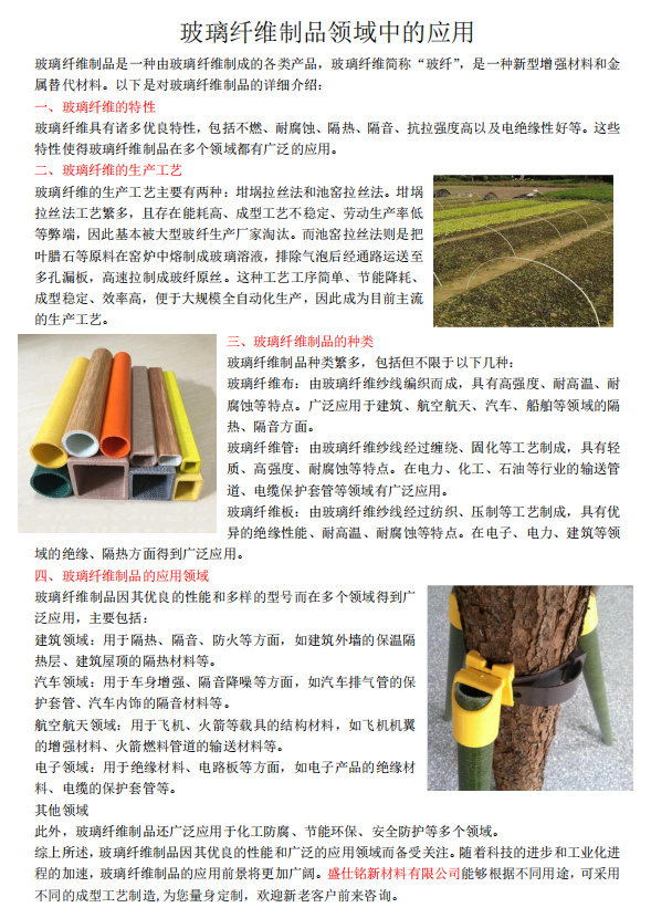 玻璃纤维制品因其优良的性能和广泛的应用领域而备受关注。随着科技的进步和工业化进程的加速,玻璃纤维制品的应用前景将更加广阔。盛仕铭新材料有限公司能够根据不同用途,可采用不同的成型工艺制造,为您量身定制,欢迎新老客户前来咨询。