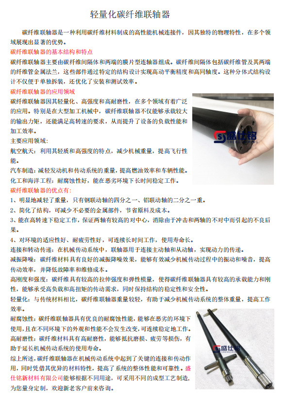 碳纤维联轴器在机械传动系统中起到了关键的连接和传动作用,同时凭借其优异的材料特性,提高了系统的整体性能和可靠性。盛仕铭新材料有限公司能够根据不同用途,可采用不同的成型工艺制造,为您量身定制,欢迎新老客户前来咨询。